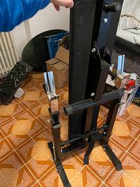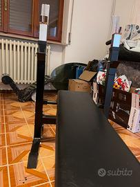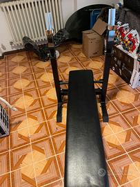 Panca piana e reclinabile con supporto per bilancere regolabile e richiudibile se non utulizzata. In buone condizioni