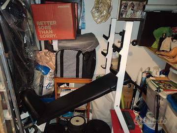 Panca piana ed alta marca Technogym con 2 dischi da 20 kg + 2 dischi da 10 kg + sacco box rivestito nuovo.