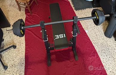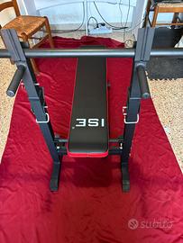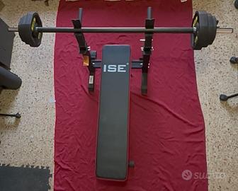 Panca Piana regolabile con bilancere e pesi per allenamento in casa. Con possibilità di spedizione.