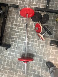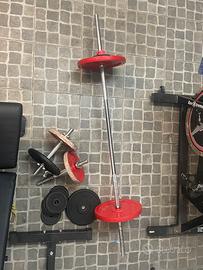 panca professionale con supporti e pesi decathlon, (50 kg piu o meno) con bilanciere e manubri, allenamento. palestra