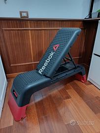 Panca multifunzione con schienale regolabile in 4 posizioni e due altezze dello step. Sullo schienale sono presenti delle fessure per agganciare i cavi elastici. Inoltre all'interno è presente un comodo vano porta oggetti. La panca è estremamente robusta e resistente. Come nuova, usata pochissimo.