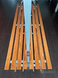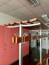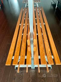 Panche da spogliatoio palestra, spogliatoio lavoro, soppie, con cappelloera e poggia scarpe, in legno e alluminio, nuove, impeccabili; peese in piu per offerta quantità. Costo al pezzo 890€, misure: L 200 Cm, L seduta totale 74 Cm (37 x2), H 183 Cm.