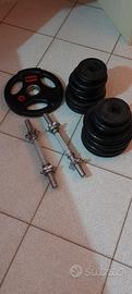 pesi da 1kg = 4 pezzi, 2kg = 10 pezzi, 5kg =4 pezzi, 1 peso da 5kg olimpionico 50mm a 3 maniglie.