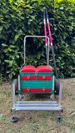 Vendo panchetto da pesca Ignesti con ruote e cassetti, completo di accessori e comprensivo di supporto per porta esche, vendo anche canna Roubasienne per carpe lunga 12 metri.