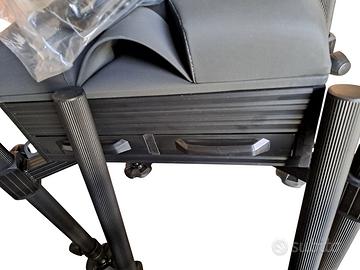Panchetto in alluminio leggerissimo con 6 gambe da 36mm per una stabilità massima. Piedi rotanti in PVC per un supporto sicuro in qualsiasi tipo di terreno. Pedana regolabile.