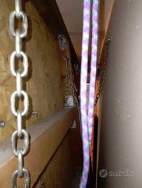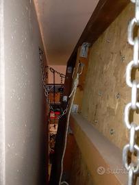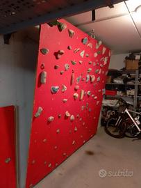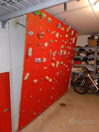 pannello arrampicata 250x235 completo di prese in foto piú un altra decina di prese grandi ed una trentina di prese medie e piccole, viteria e appoggi piedi vari. realizzato con struttura in travi di legno lavora in appoggio su base travi arrotondata x consentire l inclinazione (si inclina quanto si vuole). prezzo ribassato