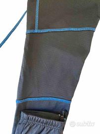 Ha solo un taschino nella parte posteriore con piccola cerniera (vedi 3º foto). Tessuto liscio, morbido ed elastico, e una parte di tessuto con leggero rilievo nella parte posteriore del quadricipite (vedi prima foto). Cerniera alle caviglie per allargare la gamba e nella stessa posizione due strisce bianche catarifrangenti.