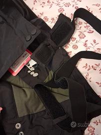 Colore nero, modello tecnico con bretelle elasticizzate regolabili e amovibili, vita regolabile, tessuto impermeabile e antivento, tasche con zip e ghette interne per evitare l’ingresso di neve.