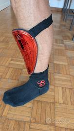 Ha una piastra rigida frontale, la chiusura a strappo regolabile e la protezione della caviglia con rinforzo per maggiore protezione da impatti.