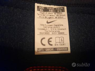 Parastinchi Nike nero e rosso metallizzato con logo Nike in oro. Sui manicotti bianchi c'è la firma Ronaldinho e il numero 10. Su entrambi i manicotti vi sono dei segni rossi dovuti a scontri di gioco, più evidenti in uno dei due (vedi foto). Taglia XL per altezza da 185 cm a 200 cm. 63% polipropilene 21% poliestere, 14% EVA, 2% spandere- made in China