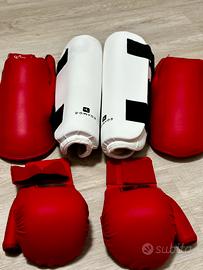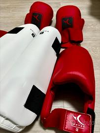 Paratibia, parapiedi e guantoni della Domyos in colorazione rossa (guantoni e parapiedi) e bianco (paratibia).