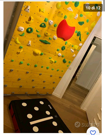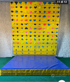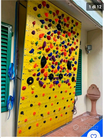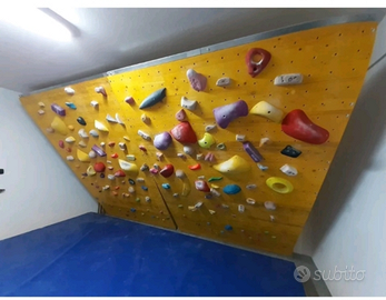 Struttura per arrampicata indoor e outdoor. Creata su misura ma superficie netta arrampicabile 2,0 mt x 2,5 mt o in alternativa 2,0 mt x 3,0 mt con inclinazione variabile. Disponibile in pratico kit di montaggio. Nella posizione verticale occupa pochissimo spazio in profondità.