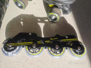 pattini a rotelle due in uno trasformabili in pattini in linea. Scarpetta traspirante e regolabile taglie 34-37. Ruote in linea mai usate. ottime condizioni, compresa scatola originale