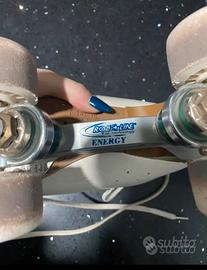 Vendo pattini in buone condizioni taglia 37 (245) (oltre a difetti estetici sono perfetti) + alcuni puntali di ricambio+ ruote ricambio+ borsa 1/2 ruote sono da sostituire Cuscinetti in perfette condizioni Ruote magnum Piastra energy Stivaletto ritmo