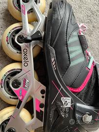 Usati molto ma comunque ancora ottimi per pattinare , livello da principiante all’avanzato perché sono molto robusti e resistenti. Taglia da 32 a 35. Il freno è consumato pochissimo. Le ruote molto silenziose.