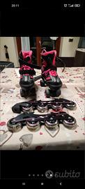 Pattini a rotelle fucsia e neri, i pattini sono nuovi, usati una sola volta e in ottime condizioni. Possono essere cambiati da 2 ruote a 4 con una chiave esagonale nella bustina. LE MISURE VANNO DAL n.38 al n.41, inoltre possono essere regolati con i lacci ed uno strappo.