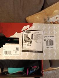 Pattini professionali Chaya di colore azzurro, numero 31-34, nuovissimi mai usati, nessun segno di usura, come si vede dalle foto. sono inclusi Casco e protezioni mai usati, nuovissimi.