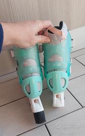 Vendo pattini a rotelle marchio Oxelo (Decathlon), taglia 30-32, colore azzurro, corredati di set protezioni Oxelo (polsiere, gomitiere, ginocchiere), taglia 2XS (<25 kg), condizioni ottime, usati pochissimo.
