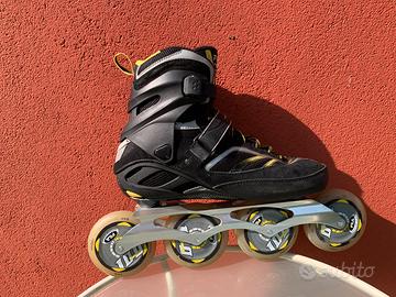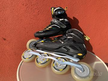 Vendo pattini a rotelle in linea marca FILA, modello FM10, ruote diametro 100 mm, larghezza 22 mm, chiusura a lacci e cinghia con velcro, taglia 43. Un gancio alla caviglia è da sostituire, si trova on line a meno di 5 euro.