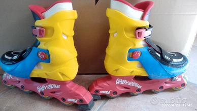 Pattini a rotelle in linea regolabili da numero 35 a 38 con ruote in ottime condizioni solo da lubrificare. Calzatura ed interno perfetti, solo qualche grazio esterno da poca usura. Indossati una decina di volte.