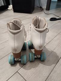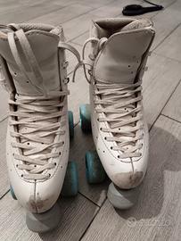Pattini a rotelle scarponcini Rondò su piastra variant numero 235 con treno di ruote parquet al 80% e tampone con due mesi di utilizzo. Nei pattini comprese anche treno di ruote per il cemento al 50%, copri pattini elastici in tela. I pattini sono in buono stato.