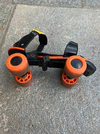 Pattini GIOCA in plastica nera con dettagli e ruote arancione.