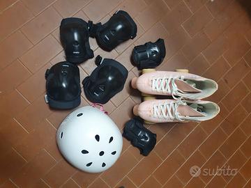 Pattini a Rotelle Rosa (Taglia 37) + Casco e Set Protezione Roller skate, quad, pattini a rotelle: 3 nomi per uno stesso modello vintage. Il loro comfort e la qualità di pattinata ti accompagneranno al coperto o all’aperto. Pattini a rotelle per iniziare il pattinaggio artistico o imparare qualche passo di dancing. Quando la caduta fa parte dello sport, il casco non è più un accessorio. Il modello classico offre protezione. Set di 3 protezioni (polsiere, gomitiere, ginocchiere) per il massimo divertimento sui roller.