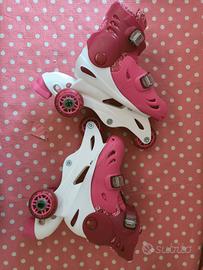 Pattini bambina allungabili da numero 30 a 33 e trasformabili da pattini a tre ruote a pattini in linea per graduale apprendimento dell'equilibrio, con freno posteriore.