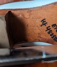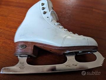 Made in USA, vera pelle e suola di cuoio. Lame Wilson. Misura 2J equivalente a 31 e 1/2. Usati ma ancora in buone condizioni.