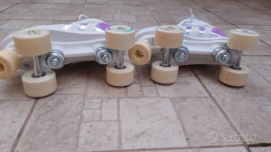 Vendo coppia di pattini misura 36 come da foto, usati due volte e relativi accessori: guanti protezione mani, ginocchiere e para gomiti misura "s" e relativa sacca da trasporto . Come nuovi, prezzo affare.