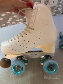 Vendo pattini Edea Rondò 235 (35) su piastra variarne M, 1 anno di vita ottimo stato, siglati Benedetta Altezza e Asya Testoni (cancellabili) solo piccole abrasioni in punta, escluso ruote e più borsa Edea