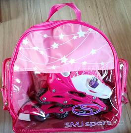 Pattini regolabili dal numero 30 al numero 33. Il set è composto da un paio di pattini 2 in 1 regolabili (pattini in linea trasformabili a quattro ruote), attrezzature di protezione (ginocchiere, gomitiere, polsiere), un casco regolabile e una pratica borsetta per il trasporto.
