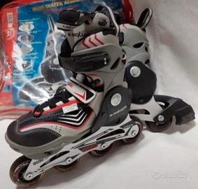 Vendo pattini in linea usati poco ,regolabili da 32 a 33 , dotati di freno posteriore , freno sostitutivo e robusta borsa per trasporto.