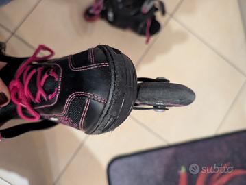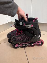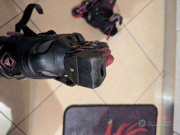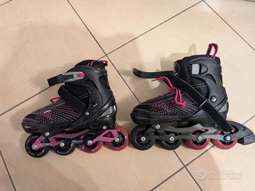 Pattini in linea per bambini con protezioni per ginocchia, gomiti e mani. Usati ma in buone condizioni. La misura va dal 34 al 37, infatti grazie ad un tasto che si trova vicino alle ruote, i pattini si possono allungare