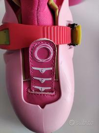 Pattini in linea per bambina, misura da 32 a 34. La misura può essere regolata attraverso la linguetta posizionata sulla calza interna. Le protezioni che includono caschetto (omologato per pattinaggio, ciclismo e skatebord), ginocchiere, gomitiere e polsiere non presentano danneggiamenti significativi se non alcuni graffi dovuti all'uso.