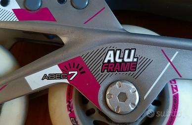 Piastra in alluminio, cuscinetti ABEC 7, scarpa anatomica cn rinforzo su tallone e caviglia, freno.