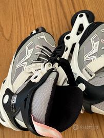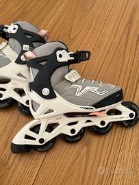 Pattini in linea per bambini. Acquistati da Decathlon e usati pochissime volte (solo in palestra). 4 ruote. Taglia da 32 a 35. Casco abbinato (vendibile separatamente), anche questo acquistato da Decathlon. Taglia 55-59 cm.