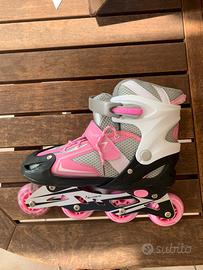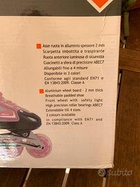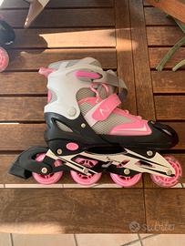 pattini in linea allungabili, rosa, rotelle che si illuminano, freno su un pattino, utilizzati una volta in perfette condizioni