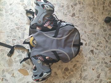 Vendo pattini in linea originali FILA + protezioni per ginocchia, polsi e gomiti + specifico zaino salvaspazio e utilissimo per trasporto in moto o bicicletta. In ottime condizioni perché usati solo alcune volte. Monta ruote da 84mm, ne ammette fino a max 90mm.