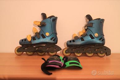 Pattini in linea usati, misura 35 di colore blu, insieme regalo anche ginocchiere