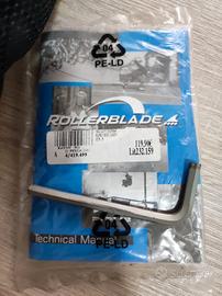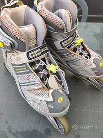Roller Blade originali con borsone, gomitiere, ginocchiere e polsiere. Presenta piccoli segni di uso che possono andare via con una pulizia mai fatta (schiuma per divani, Citrosil, Napisan o sgrassatore) ma i pattini sono perfetti. Gli accessori sono nuovi mai usati.
