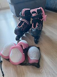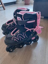 Pattini in linea per bambina, regolabili da taglia 26 a 33. Nuovi, mai utilizzati! Completi di protezioni per gomiti e ginocchia. Valore commerciale 60,00 €, prezzo di vendita 30,00 €