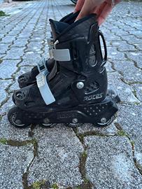 Vendo pattini in linea marca Roces, modello NRT Tokyo, di colore nero con dettagli grigi. Si tratta di pattini di ottima qualità e Made in Italy. I pattini sono usati e presentano i classici segni di usura superficiale (graffi sullo scafo) che non compromettono in alcun modo il funzionamento delle ruote o dei ganci. Le ruote e i cuscinetti sono in buone condizioni. Caratteristiche principali: Taglia regolabile: Copre dal numero 30 al 35. Chiusura: Sistema a due leve. Struttura: interno imbottito. Freno: Presente sul pattino destro. Disponibile spedizione o ritiro a mano.