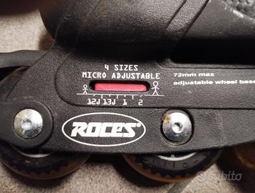 Pattini in linea ROCES regolabili 30-35; Ottime condizioni, usati forse due volte, perfettamente funzionanti, scorrimento ruote perfetto. Senza confezione originale.
