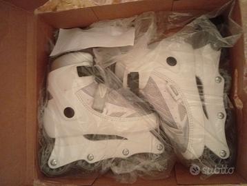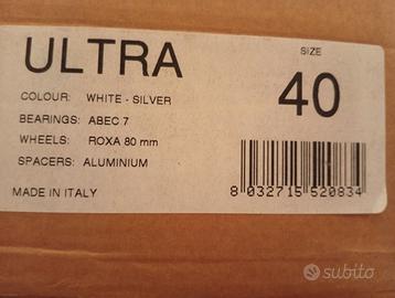 Pattini in linea Roxa(made in Italy) nuovi,.provati solo in casa come dimostrano le foto delle ruote, freno e stivale. Modello Ultra, colore bianco, n40 unisex.