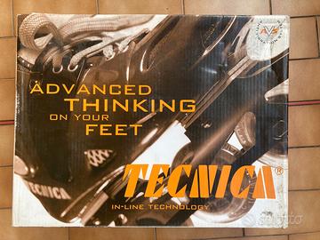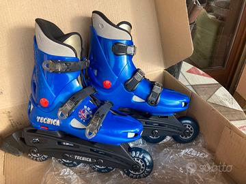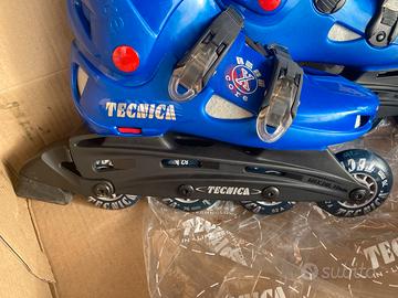 Pattini in linea regolabili, della TECNICA, dotati di tre ganci. Ruote da 76 mm ideale per un equilibrio tra velocità e maneggevolezza. Scarpone rigido di colore blu con supporto ottimale della caviglia. Numero 38 (EU/IT) (cm piede 24,5 –UK 5,5). Ottimo stato, usati una sola volta, praticamente nuovi. Set di protezione per ginocchia, gomiti e polsi, disponibile e acquistabile a parte