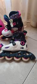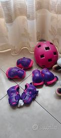 Vendo per inutilizzo pattini usati misura 28-30. Casco di protezione taglia S (52-54cm) indossato una volta. Kit protezione polso, gomito e ginocchio taglia 2XS . Adatto per bambine fino a 7 anni. Solo le ginocchiere presentano graffi . Il restante kit ( gomiti, polsi e casco) come nuovo .