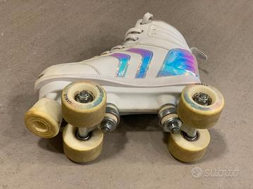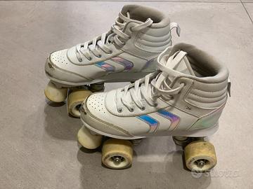 Pattini bambina misura 36 Oxelo 54x32 mm in buone condizioni, eccetto le sbucciature sulla parte anteriore, come da foto, indossati poche volte. Scarpa intercambiabile e pattini completamente smontabili, cuscinetti delle ruote praticamente nuovi. Venduti con la formula visti e piaciuti. Preferito scambio a mano su Roma.