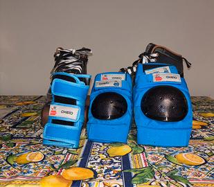 Guarda le foto allegate per i dettagli: pattini da diverse angolazioni, protezioni e confezione con tabella taglie.