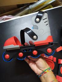 Pattini in linea per imparare ad andare sui roller. Completi di ginocchiere. Da inserire sulle scarpe. Misura massima della scarpa interna 20 cm, minima 14cm